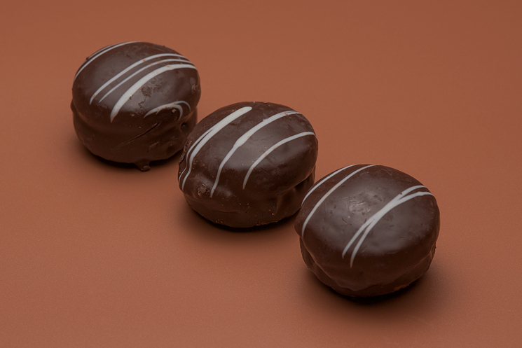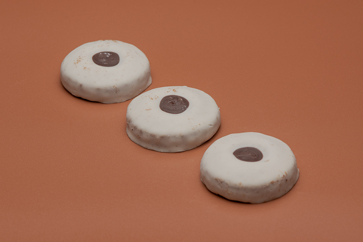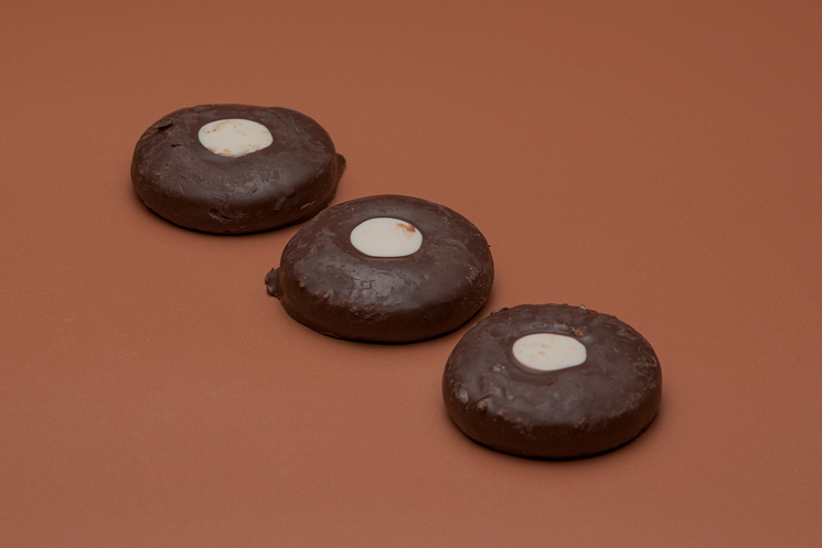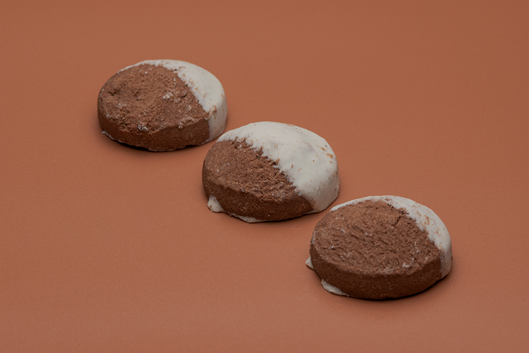 Una galleta de harina de trigo con un delicioso sabor a cacao, bañada en chocolate blanco y con un centro relleno de chocolate negro. ¡Una combinación irresistible que te hará volver por más