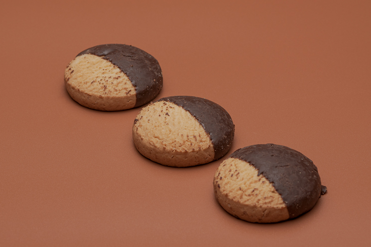 Sabrosa galleta de harina de trigo con un delicioso toque de mantequilla, medio bañada en irresistible chocolate negro ¡Una combinación perfecta de sabores que te cautivará!