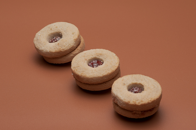 Una exquisita galleta de harina de trigo, rellena con mermelada de frutilla. ¡Cada bocado es una combinación perfecta de texturas y sabores que te transportará a un mundo de dulzura y alegría!