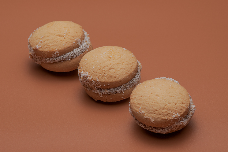 Tierna galleta de mantequilla con harina de trigo, rellena de delicioso manjar repostero y adornada con coco rallado. ¡Una explosión de sabores dulces y exóticos en cada mordisco!