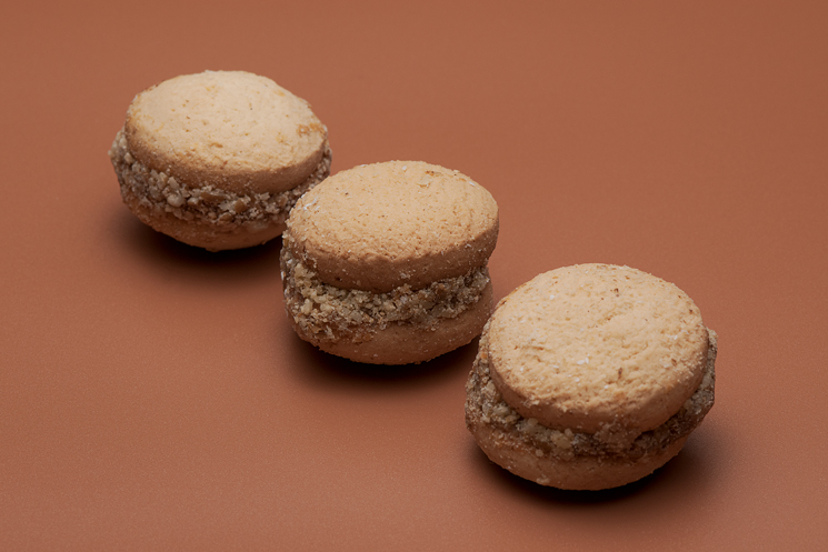 Deliciosa galleta de sabor mantequilla, elaborada con harina de trigo y rellena de exquisito manjar repostero. Cada galleta está decorada con nuez molida para un toque crujiente e irresistible. ¡El equilibrio perfecto entre dulzura y textura en cada bocado!